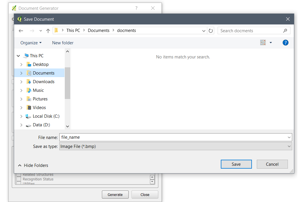 You can save the generated document either in a location that you have chosen or in the output folder as specified in the Configuration Wizard or Options.