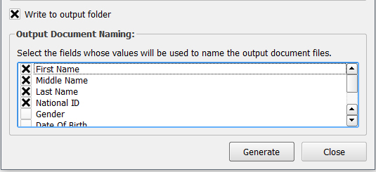 The box Output Document Naming gets active so that you can also choose and sort the values to be used in the document file name.