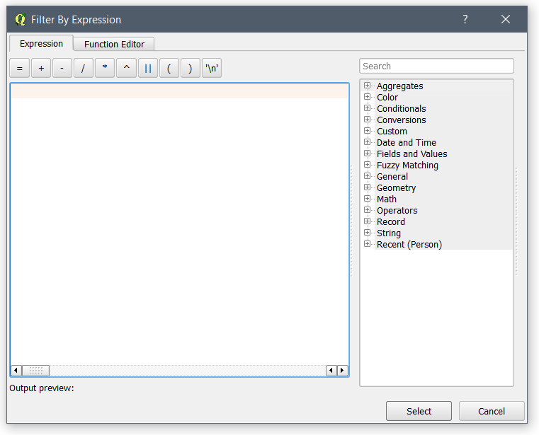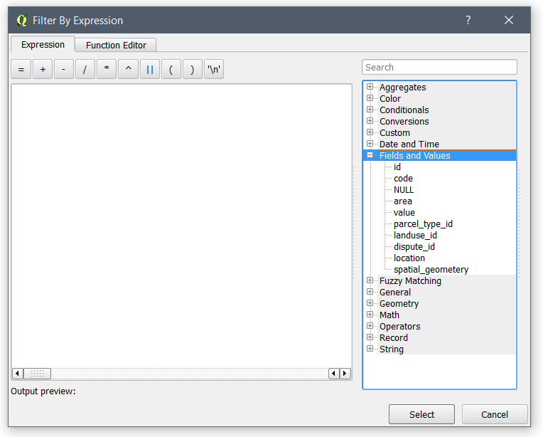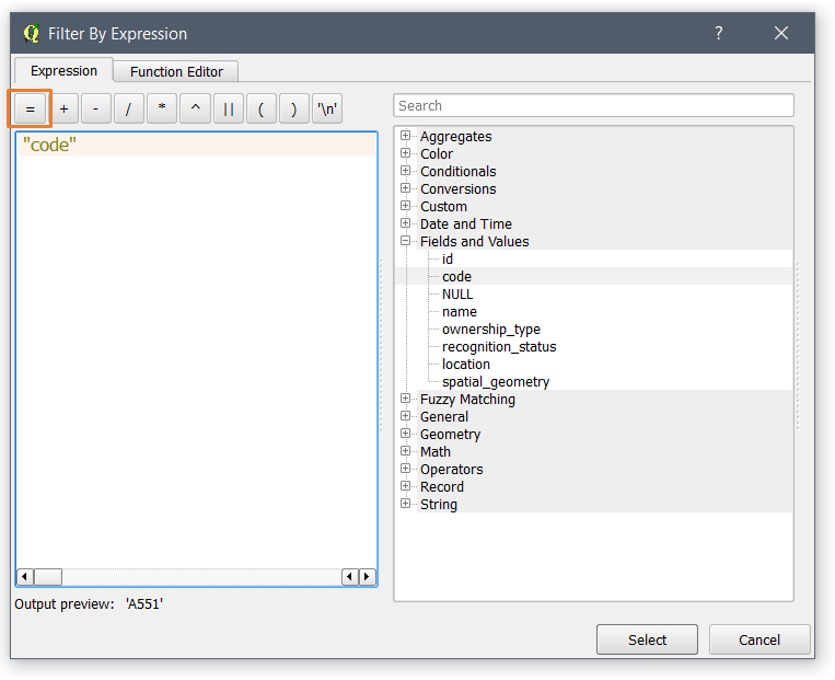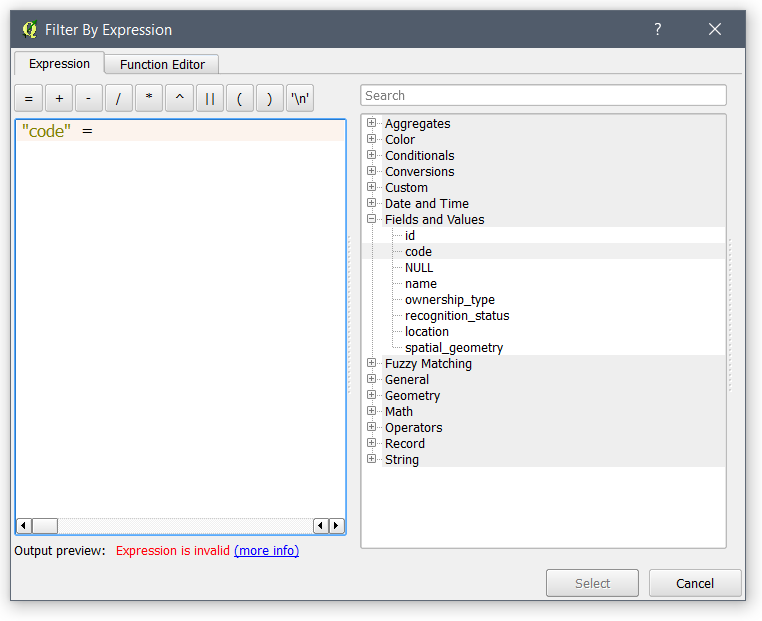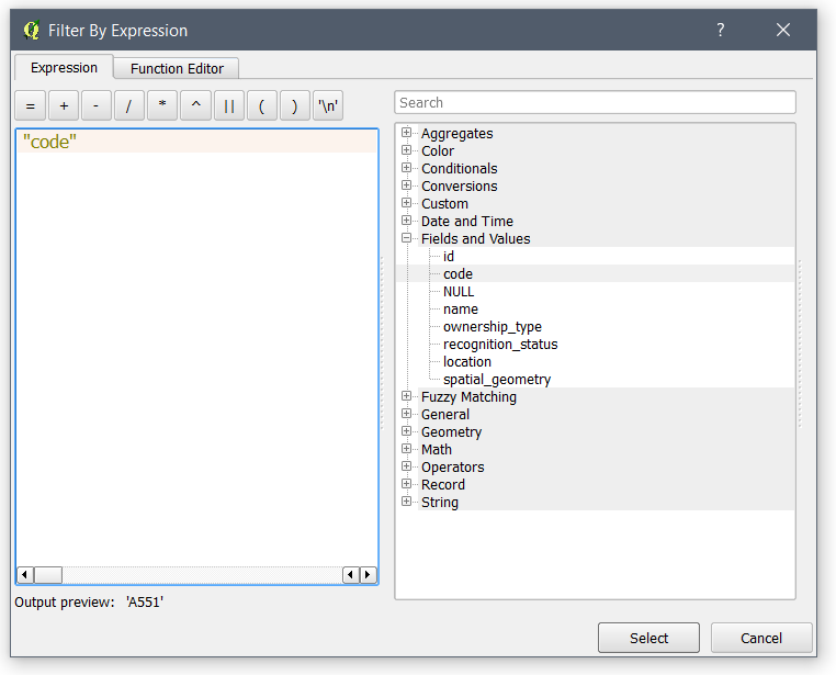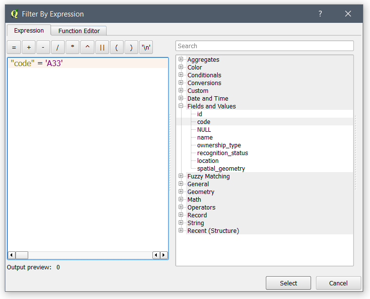 The sub-steps below show how you can select a record using the QGIS Expression dialog.